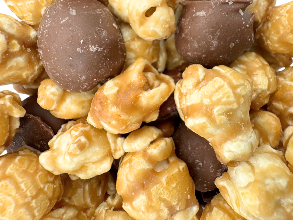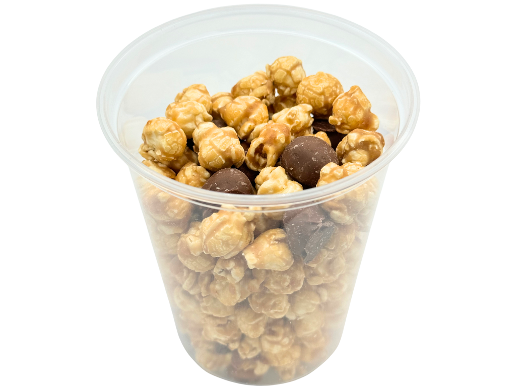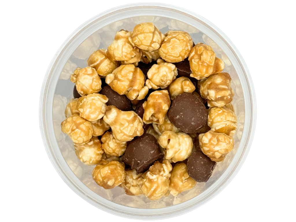 This irresistible treat features fluffy popcorn coated in a rich, caramel glaze and sprinkled with a mix of crunchy nuts and sweet chocolate.