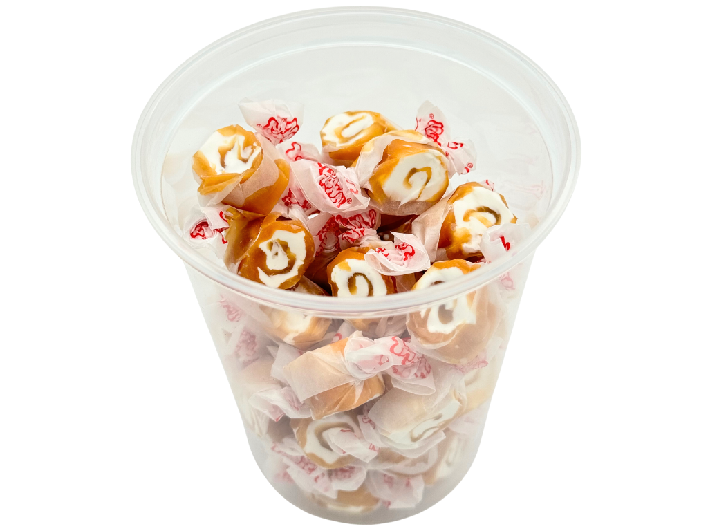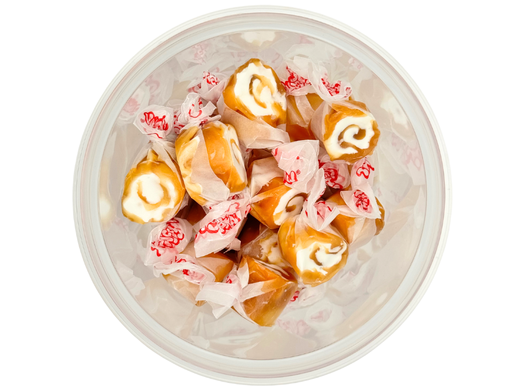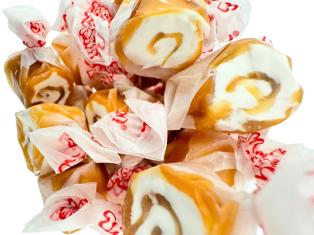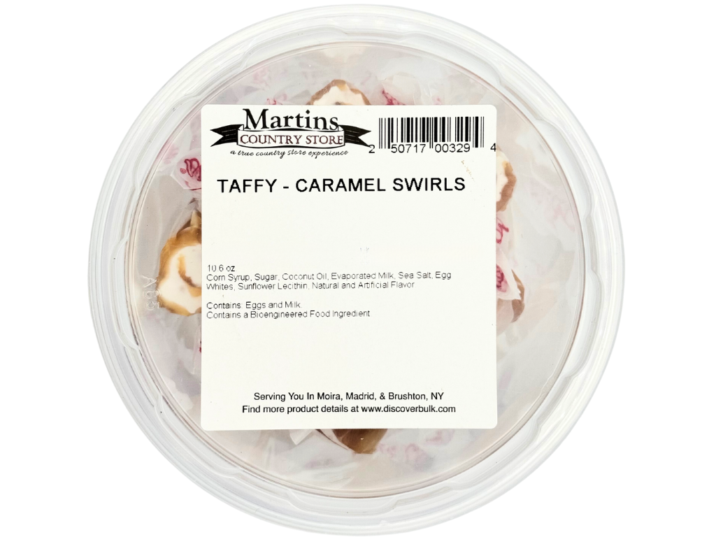 Each piece features a rich, creamy caramel flavor twisted into soft, chewy taffy, creating a delightful combination of textures and tastes. Perfect for a satisfying treat or a nostalgic snack, these caramel swirls offer a luscious burst of flavor in every chewy bite.