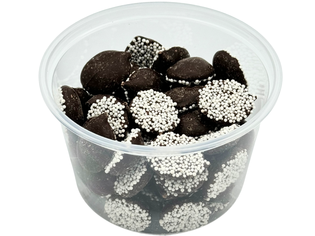 Each piece features rich, smooth dark chocolate generously coated with crunchy white sugar sprinkles, creating a delightful texture and a perfect balance of sweetness and richness.