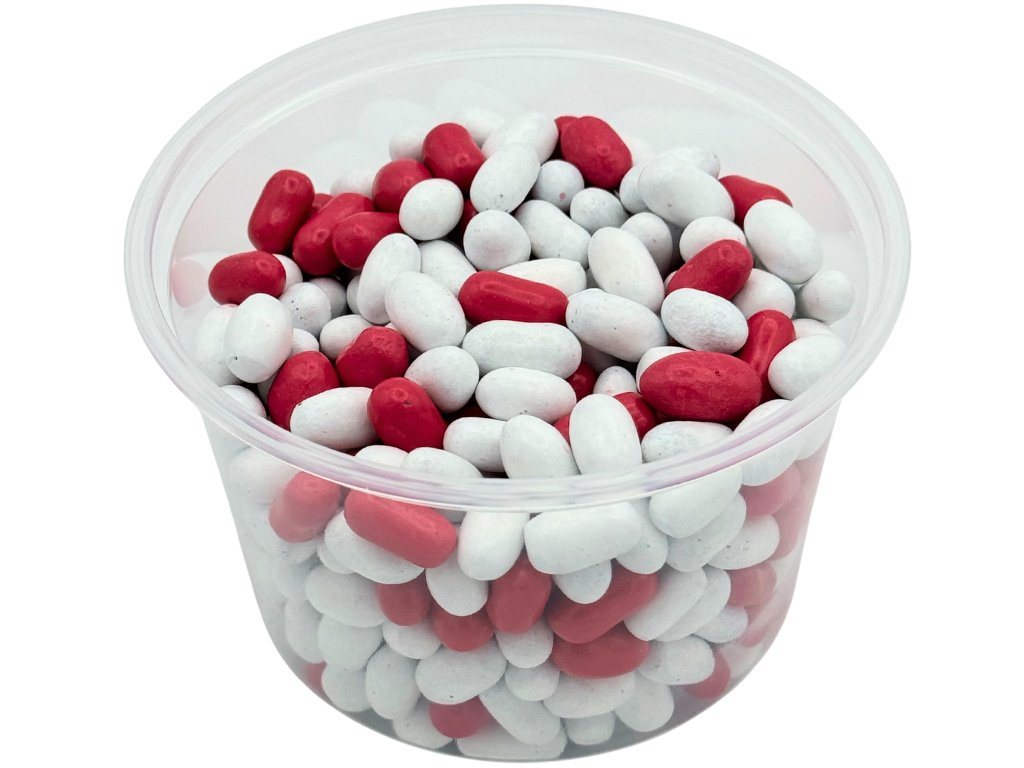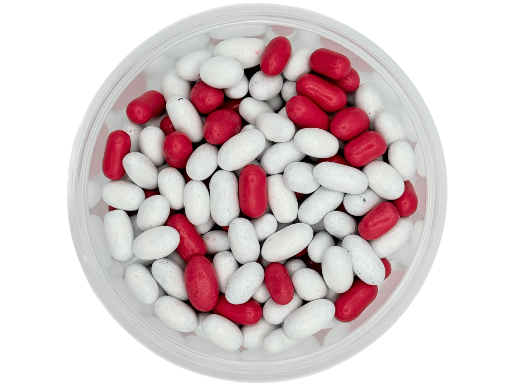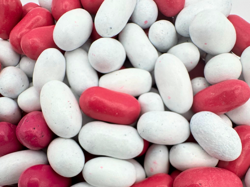Each piece features a soft and chewy black licorice center coated in a colorful candy shell, with the iconic pink and white candies adding a playful touch to every handful.